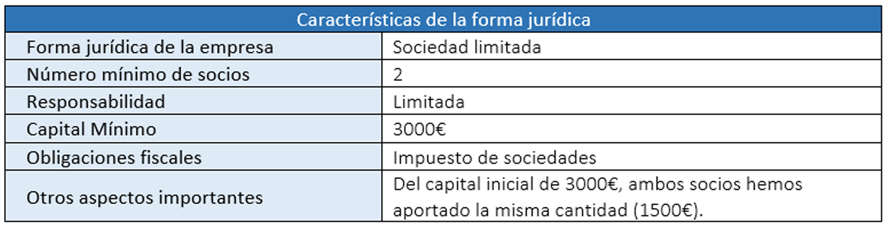 e. Nombre de la empresa: teniendo las dos opciones de Sociedad Limitada y Sociedad Limitada Nueva Empresa, hemos decidido finalmente la Sociedad Limitada porque podemos elegir el nombre de la empresa. En cambio, en la Sociedad Limitada Nueva Empresa nos obliga a poner como nombre de empresa alguno de nuestros nombres, lo que no nos gustó para nada.