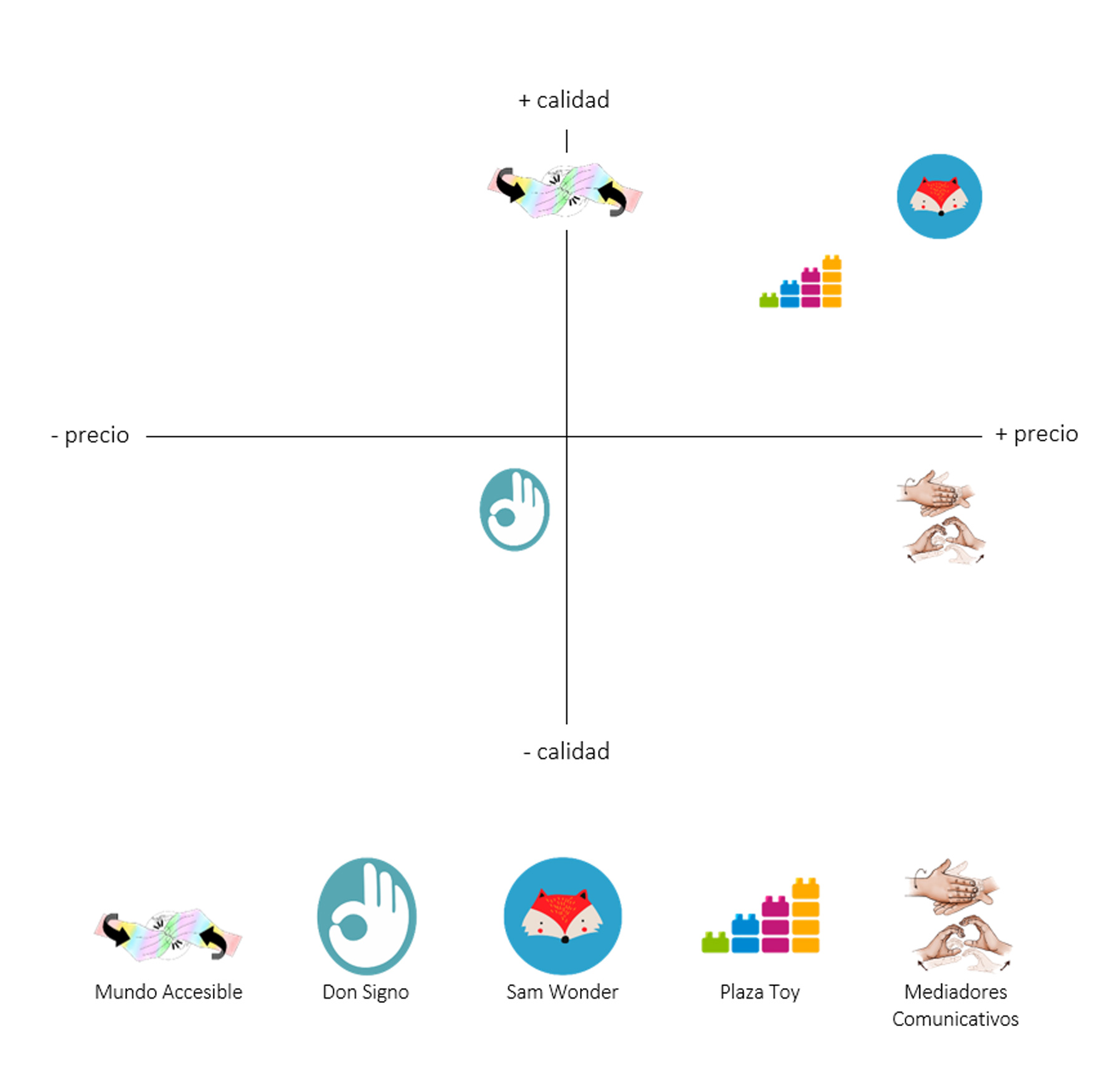 El mapa de posicionamiento. En este mapa se sitúa nuestra empresa, Mundo Accesible, junto a las principales empresas de la competencia y el producto sustitutivo con más fuerza.